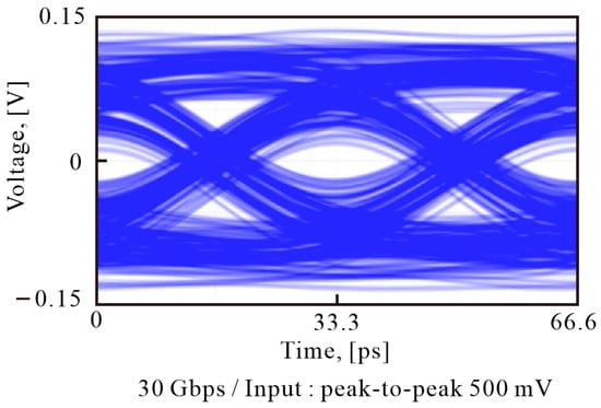 We use a 32 GHz arbitrary waveform generator (AWG, Keysight M8195A) and a 33 GHz oscilloscope (Keysight UXR0334A) to measure the 30 Gbps OOK modulation signal of the RF probe card. The signal transmission performance of the proposed probe card is measured by delivering a peak-to-peak voltage of 0.5 V to the probe card, and the measurement results are presented in Figure 6. The probe card is able to deliver signals of tens of Gbps in the 5G band without any problems, indicating that it can be used to measure the performance of 5G band communication chips in the future.