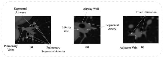 Anatomy of Vessels in CT Data: (a) Close Proximity of Arterial and Venous Trees; (b) Proximity of Airway Wall to Arterial Tree; (c) Vessel Bifurcation.