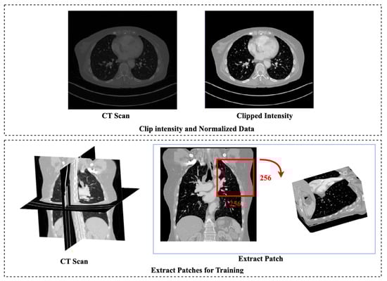 - In order to target the lung area, Intensities are clipped to [−800, 500] HU. Due to the nature of CT data, clipping is required. The range of HU values is wider than what can be displayed. The use of clipping ensures that the same structures are assigned similar values after the operation, regardless of the CT scanner on which they were collected. By limiting the intensities to [−800, 500] HU, we focus on the range that is more likely to capture pulmonary vessels and reduce the impact of unrelated structures or artifacts Figure 1.