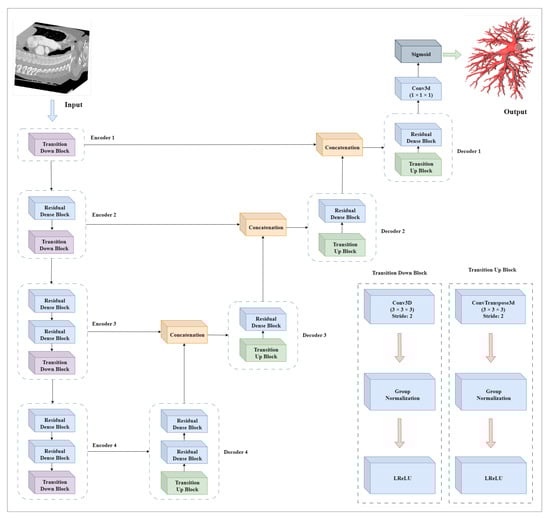 The Dense Residual U-Net is constructed with a four encoder and four decoder blocks to calculate features for the segmentation of the pulmonary artery. To extract the information, the encoder is composed of different combinations of transition down block and residual blocks. The encoders gradually decrease the spatial dimension of the input and increase the number of channels. After each encoder, the spatial dimension is halved, while the number of channels is increased. Progressively, the encoders compute the high-level feature and preserve low-level details. Furthermore, in encoders, a transition down block is introduced instead of max-pooling layers. The maximum pooling layers can lead to information loss since they down-sample feature maps by selecting the maximum values from the neighborhoods. Consequently, a network can be less accurate in segmenting input images. To reconstruct the sample, the decoders are introduced with the combinations of transition up blocks and residual blocks. The decoders gradually increase the spatial dimension of the input while decreasing the number of channels. Each decoder performs an up-sampling operation which is followed by a feature map concatenation of the corresponding encoder block. The decoders reconstruct a high-resolution segmentation, map using the features computed by encoders.