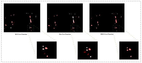 where N, , and represent the sum of pixels, ground truth, and predicted label, respectively. During the training process, the Dice loss function can be unstable. If the , and are relatively small compared to the background, the estimated gradient of Dice loss significantly varies.