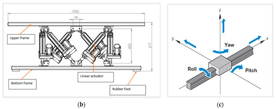 Design of the six degrees freedom motion platform of the used simulator: (a) the components of the platform from the top; (b) the components of the platform from the side; (c) illustrates the Pitch, Roll, Yaw axis enabling 6-DOF for the platform movement.