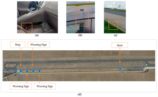 The road situation was established by installing warning signs, as shown in Figure 5c, to alert the drivers to the impending railway crossing and prompt them to reduce their speed. As illustrated in Figure 5a, the track includes three unique warning signs with stripes placed at 80 m (three stripes marker), 160 m (two stripes marker), and 240 m (one stripe marker) ahead of the railway crossing, which gives the necessary time to gradually reduce speed to the target from a high initial velocity (≥120 km/h) based on the stopping sight distance in Equation (1).