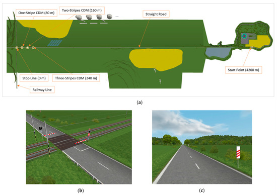 Traffic scenario designed for the virtual reality experiment: (a) track layout from the top view with distances to end point; (b) the stop line at railway crossing; (c) screenshot of the Count-Down Markers (CDM) used as warning signs (80/160/240 m distance).
