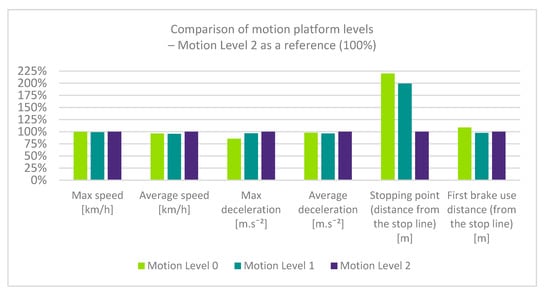 The summary data shown in Figure 7 indicated very low differences in maximum speed, average speed, and average deceleration when driving with different levels of motion cues. However, other values differed significantly, particularly the accuracy of braking and maximum deceleration. While performing a self-assessment and subjective evaluation of the driving simulator, the test drivers preferred the Motion Level 1 setting, which they considered to be the most realistic and to provide relevant feedback. This fact is confirmed by the summary results, particularly the lowest average speed and the lowest average deceleration. However, a more detailed analysis of braking behavior elaborated in Section 3.2 showed unrealistic aspects of braking with the Motion Level 1 simulator setup. Specifically, we point out a high maximum deceleration and “pumping” of the brake pedal, which would be very uncomfortable in a real vehicle (see Figure 8).