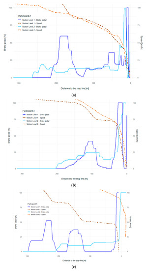 Comparison of braking behavior with Motion Levels 1 and 2: (a) braking behavior of Participant 2, (b) braking behavior of Participant 3; (c) braking behavior of Participant 5.