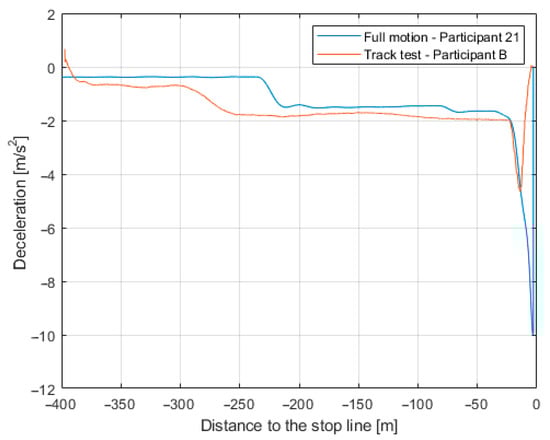 While the curves of the selected participants’ drives show deceleration peaks (brake pedal press) that are unrealistic compared to real car data of deceleration shown in Figure 9, these peaks are predominantly located in the final braking at low speed (below 5 km/h).