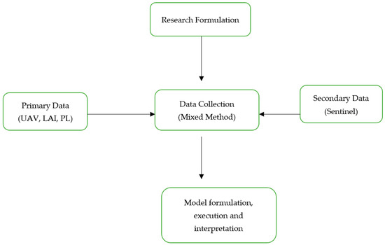 Figure 1 illustrates the research design which has been implemented for the completion of this study. Both primary and secondary data were used to complete this work. The data collection method is termed a mixed method because both primary and secondary datasets have been used here. Primary data were collected from a field-based survey and remote sensing imagery was the secondary source data. As a part of primary data, the imagery was obtained from the Unmanned Aerial Vehicle. Secondary data source incorporated the use of sentinel based satellite imageries.
