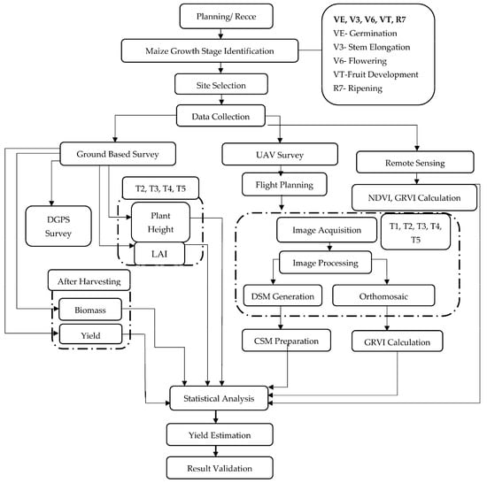 First and foremost, visiting the proposed project site was one preliminary task. GCPs were established and the coordinates of the GCPs were determined with the help of DGPS. Images of the plot only (without crop) were taken with the help of an Unmanned Aerial Vehicle (RGB spectral bands). Then, UAV images were taken at numerous phenological stages of the maize plant life cycle to monitor the crop growth and to estimate yield [29,30]. From the acquired images, Orthophoto, DTM, and DSM were created. DSM is needed for average crop height. From the generated Orthophoto, Green–Red Vegetation Index was calculated. Leaf Area Index (LAI) was calculated from the field-based method in which the area of the leaf is computed with the help of a measuring tape. Around 25 sample points of areas of 1 m2 (1 m × 1 m) were chosen in the field. The average Plant Height, Biomass, and LAI of the sample points were computed to generalize our result. From the computed values, GRVI, LAI, Biomass and Plant Height, Yield of the crop plot was estimated. Variations in LAI wrt Yield and Biomass, Plant Height wrt Yield and Biomass, GVI wrt Biomass and Yield, GRVI wrt Biomass and Yield and GVI and GRVI wrt Biomass and Yield were modelled with the help of respective graphs between them. NDVI was also calculated using a Sentinel-based product from Google Earth Engine [31]. A Sentinel satellite dataset is a collection of data collected by the European Space Agency’s (ESA) Sentinel satellites. These satellites are part of the Copernicus program, a large Earth observation program which collects data about land, marine, and atmospheric environments. The data collected by the Sentinel satellites are used to monitor and study climate change, natural disasters, land use, and other environmental conditions. Sentinel datasets can be used for a variety of applications, including monitoring of agricultural land, mapping glaciers, assessing deforestation, detecting oil spills, and studying ocean currents. The NDVI product was also used to estimate the yield. Finally, all the parameters were used to determine the yield and validated with the actual yield from the ground.