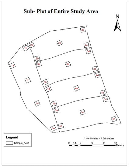 The whole project area was divided into five different sample areas based on the area of the individual plot (Figure 4). Further, the sample area was divided into five different sub-plots based on the clustered sampling technique as 1a, 1b, 1c, 1d and 1e for Sample Area 1. Similarly, for Sample Area 2, these sub-plots were divided into 2a, 2b, 2c, 2d and 2e sample areas. Further, other sub-plots were classified accordingly.