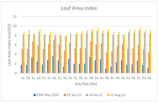 Figure 6 shows the Leaf Area Index of the maize plant in the project area at different phenological stages (26 days for first phase, 22 days for second phase, 25 days for third phase). According to the graph, LAI value ranges from 0 to 9.55. According to the data obtained on 8 August, the value of the growth of a plant is higher in Sub-plot 5, i.e., 5a, 5b, 5c, 5d and 5e. The LAI on 8 August was affected by rain and wind, causing the leaf of Sub-plot 2e to be zero, meaning that the plant was dead. LAI seems to be continuously increasing in different phenological stages, starting on 25 May 2021, 22 June 2021, 14 July 2021, and ending finally on 15 August 2021.