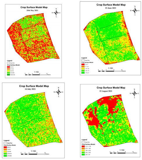 Figure 7 shows the Crop Surface Models of the project area at different phenological stages. The CSM on 25 May shows that the plant height is in the range of 0 m to 2.4 m. The growth of a plant is maximum in Plot T9 and Plot T10 and low in Plots T3, T4, T5, and T6. The CSM on 23 July shows that the height of plants is in the range of 0 m to 4 m. The growth of a plant is maximum in Plots T9 and T10. The CSM maps show the plot-wise comparison of the plant height at different growth stages. The change in plant height in each plot is seen on the CSM maps generated on a different date. From the above maps, it is seen that the overall growth of a plant is maximum in Plot T9 and Plot T10.