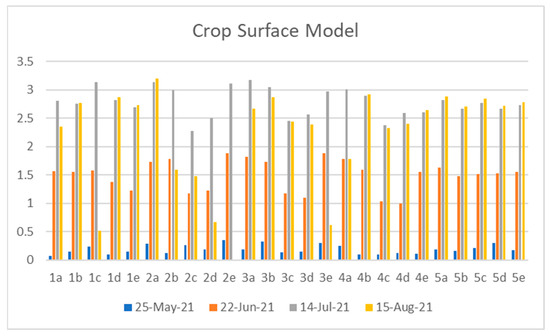 Figure 8 shows the plot-wise plant height of the plot at different growth stages generated from the Crop Surface Model. The variation in plant height in various plots at numerous developmental phases helps in monitoring the growth of a plant. The graph shows that the overall growth of a plant is maximum in Plot 4 and Plot 5. Since Plots 1, 2 and 3 were adversely affected, the Plant Height value in these Plots also seems to be highly affected. In Plot 2e, Plant Height seems to be 0, meaning that all the plants in that sample plot were dead during the image acquisition at the last time frame, i.e., 15 August 2021.