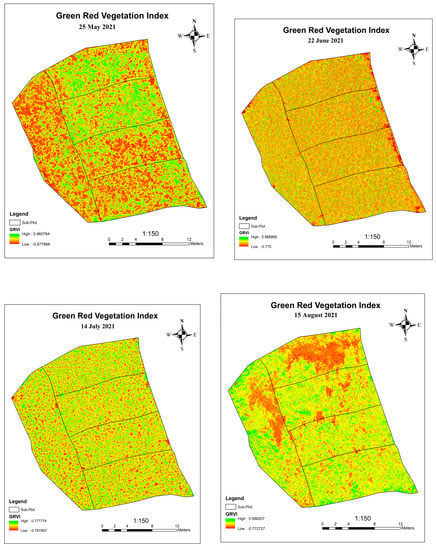 Figure 9 shows the Green-Red Vegetation Index at different growth stages. The change in GRVI value shows the growth pattern of the plants. The GRVI map generated on June 22 shows that the GRVI value at that stage ranges from −0.2 to 0.2 and there is a similar pattern of GRVI in each sub-plot, which shows that there is a similar growth pattern of plants in each sub-plot. The negative GRVI value represents that there is the less green pigment in the plant, i.e., the reflectance value of visible red light is greater than the that of visible green light. The GRVI map generated on May 25 shows that the GRVI value at that stage ranges from −0.2 to 0.4 and there are maximum GRVI values in Plots 1 and 3. Similarly, the GRVI map generated on July 14 shows that the GRVI value at that specific time period ranges from 0.2 to 0.4 at different sub-plots. Finally, after the image acquisition on 15 August, GRVI map was generated on which GRVI value slightly declined to that of 14 July. Even at the final growth monitoring stages, GRVI value at different sub-plots declined randomly; this is because the plant in that region was dead because of heavy rain and wind at that time.
