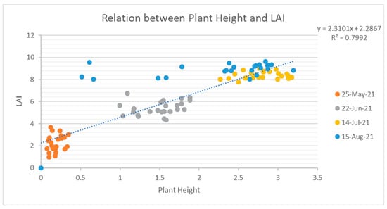Prior to these, some of the outliers can even be seen in the graph, meaning that the final stage of the maize plant was monitored with the acquisition of image on 15 August, and several plants were found dead, so their Leaf Area Index was mismatched.