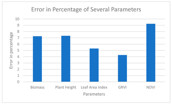 The error in Sample Plot 5 with several parameters such as Biomass, Plant Height, Leaf Area Index, Green–Red Vegetation Index and Normalized Difference Vegetation Index was generated in Figure 15. The maximum error was seen on the Normalized Difference Vegetation Index parameter, which was 8.67%, and the minimum error was seen on the Green–Red Vegetation Index parameter, which was 1.07%. This actually demonstrates that GRVI is the most important parameter in yield calculation. NDVI was derived from a Sentinel-based product. NDVI has a lower resolution compared to the other data here. This might be the reason why NDVI has deviated more from the actual value in comparison to the other parameters.