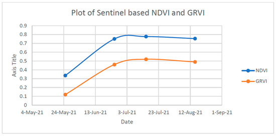 Figure 15 shows the values of Normalized Difference Vegetation Index and Green Red Vegetation Index on four different dates (25 May 2021, 25 June 2021, 15 July 2021 and 15 August 2021). NDVI is a measure of the amount of vegetation present in an area and is used to measure the health of vegetation. GRVI is a measure of the relative greenness of an area and is used to estimate the photosynthetic activity of an area.