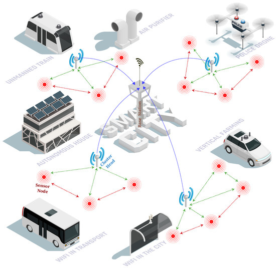 In recent years, IoT has emerged as one of the most prominent areas of research where researchers hope to take control of daily activities through the Internet and improve the quality of life [1,2,3,4,5,6]. Various technological objects from the environment (e.g., cars and smartphones) are included in IoT [7,8]. With the integration of computational capabilities, it has become capable of achieving a huge leap in a variety of applications including home, military, healthcare, entertainment, and many other disciplines [9,10,11]. The Wireless Sensor Network (WSN) is the base technology underpinning the IoT, which has recently sped up advancements in several applications [12,13,14,15,16,17,18]. WSN can be comprehended as a contemporary information technology that integrates a variety of components, such as sensors, wireless communication, distributed data processing, and low-power embedded components, into a single system. In a WSN, there are many low-cost Sensor Nodes (SNs) that can detect, monitor, and gather environmental data in real time. These SNs can be static or dynamic. The self-organization and collaboration of WSNs have opened up a variety of real-time application possibilities including military, disaster relief, and emergency services that demand real-time information for effective planning and coordination [19]. Many applications, such as disaster recovery, video conferencing, and emergency treatment, have witnessed the considerable use of WSNs. The primary benefits of the WSN are its low price and distributed intelligence. It saves costs on installation and maintenance since it uses inexpensive wireless devices [20]. The IoT combines a number of technologies, including big data, WSN, and cloud computing [21,22]. Sensing, collecting, storing, and transmitting data to the Base Station (BS) are the main tasks of the IoT elements [23,24]. Data collection from large WSNs is a major obstacle for the development of IoT technology [25,26]. Therefore, it is required to find creative ways that extend the lifetime of the networks [27,28].