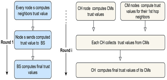 This section explains how the trust value of each SN in the network is determined. It is based on the work in [36]. The different steps executed in the trust model during the first round and the subsequent rounds are shown in Figure 2. As evident from Figure 2, the setup process for trust value calculations starts in the first round (Round 1). In this process, each node monitors its neighbor nodes’ behavior and calculates its neighbors’ trust values based on specific metrics that are determined and adjusted according to the required application. Then, each node sends the calculated trust values to the BS. Following that, the BS divides the nodes into clusters. For the process in the subsequent rounds (Round i), the nodes have been divided into CHs and CMs. Each CM computes the trust value about its neighbors in the same cluster and sends the computed value to its CH. Additionally, the CH computes the trust value of each CM. Then, each CH collects the trust values from its CMs and computes the final trust value of its CMs.