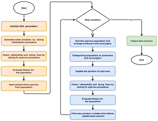 Meta-heuristic algorithms are one of the promising methods for resolving such optimization issues. SSA is a meta-heuristic method that can be employed to solve the clustering problems in a WSN. SSA [63] was designed in 2020 to simulate the social behavior of sparrows. In real-world applications, SSA can be used to solve various problems [64]. The SSA population is split into producer and scrounger groups with respect to the foraging behavior of sparrows. Food sources are identified by the producer group, whereas the scrounger group is involved in collecting the food from the producer group. When the sparrow identifies a predator, it generates an alarm, and whenever the alarm value surpasses the threshold for safety, the producers must guide all scroungers toward a safe zone. In the event of danger, the sparrows at the edge of the group fly quickly toward the safe area, whereas those in the center of the group move randomly to be close to one another. The details about the SSA framework can be found in [63,64].