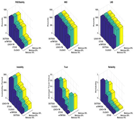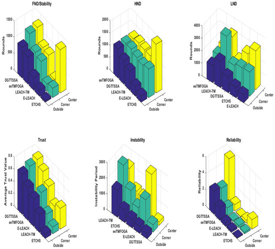 In summary, Table 3 shows a comparison of the proposed DGTTSSA and other algorithms in terms of FND, HND, LND, ATV, stability, instability, and reliability for different BS locations. Table 4 shows a comparison of the proposed DGTTSSA with others in terms of FND, HND, LND, ATV, stability, instability, and reliability for 10%, 20%, and 30% of malicious nodes. Hard thresholds for trust and energy employed in ETCHS for CH selection have a negative effect on the network lifetime, reliability, and ATV. While LEACH-TM and E-LEACH algorithms adopt a random CH selection mechanism which may increase the probability of electing nodes with low trust values, LEACH-TM employs the trust aware random mechanism and E-LEACH employs a random mechanism that is not trust-aware. Generally, random mechanisms may increase instability periods and reduce reliability and the ATV. Since eeTMFOGA has no threshold for trust values, CHs with lower trust values may be selected. In addition, when the increases, it is obvious that nodes with lower trust values are selected. On the other hand, DGTTSSA adapts SSA and is modified by initializing its population with a partially generated population based on a trust-aware random mechanism and with a fitness function designed to be weighted by nodes’ counts that satisfy both energy and trust thresholds. Moreover, DGTTSSA employs dynamic energy and trust thresholds to overcome hard threshold drawbacks that do not reflect the current network state. The benefit of this is an improvement in network lifetime, stability, reliability, and ATV.