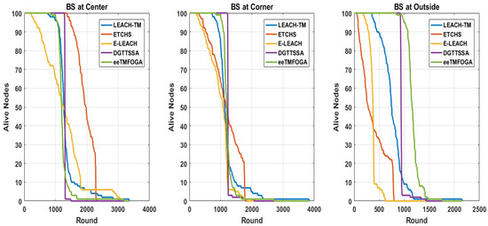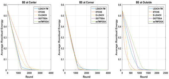 Here, we discuss the effect of increasing the percentage of malicious nodes () on DGTTSSA, ETCHS, eeTMFOGA, LEACH-TM, and E-LEACH. The is varied up to 10%, 20%, and 30% (with BS at the corner) using the same settings presented in Table 2. Figure 8 shows the stability period influence with varying values. From this figure, it is noticed that DGTTSSA’s stability period decreases as the increases. Moreover, DGTTSSA has better stability than ETCHS, eeTMFOGA, LEACH-TM, and E-LEACH. We can also notice from Figure 8 that the instability period for DGTTSSA and ETCHS increased as the increased. Moreover, it is clear that LEACH-TM has the highest instability period followed by ETCHS, E-LEACH, eeTMFOGA, and then DGTTSSA. The relationship between alive nodes’ count over time and the is shown in Figure 9. It can be noticed from this figure that when is 30%, the nodes die earlier. The effect of the on reliability, as given by Figure 8, shows that the reliability is dropped in DGTTSSA as is increased. In all values, the DGTTSSA has the best performance compared to the others. Moreover, ETCHS and E-LEACH have the least reliability for all values. The effect of on the ATV illustrated in Figure 8 shows that the ATV value decreases as increases. This is because the choices available for electing nodes with a high energy and trust value are decreased; despite this, DGTTSSA picks the CHs whose ATV values are greater than the trust threshold value for all values. This is due to the fact that the DGTTSSA’s design considers both energy and trust when evaluating and choosing nodes. Additionally, it can be noticed from Figure 8 that ETCHS and LEACH-TM provide the least ATV for all values. From Figure 10, it can be observed that the average residual energy decreases as the increases and follows the same pattern.