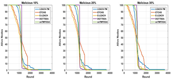 Alive nodes comparison over rounds results of varying the percentage of malicious nodes.