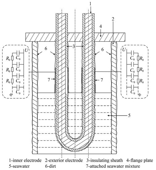 A schematic of a dirty U-shaped liquid level sensor is shown in Figure 1. A sinusoidal RF excitation voltage with angular frequency is applied between the inner and outer electrodes of the U-shaped liquid level sensor. The inner side of the insulating sheath is directly linked to the inner electrode, while the outside side is connected to the outer electrode through the seawater being measured. From an electrical point of view, since the liquid level sensor works with radio frequency, the size of the attached seawater mixture does not reach the condition of being much smaller than the wavelength of the radio frequency signal. This means that the attached seawater mixture should be processed using the distributed parameter circuit.