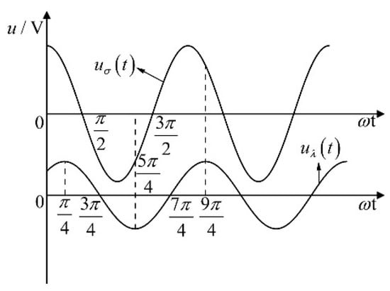 Figure 5 demonstrates that the phase of lags behind the phase of by , where the voltage is only related to the output capacitance of the sensor when the attached seawater mixture is removed and it has nothing to do with the equivalent capacitance of the seawater mixture attached to the left cable or the equivalent capacitance of the seawater mixture attached to the right cable. The voltage is related to the capacitances and . The output voltage results from the interaction between and . To remove the impact of the equivalent capacitance and on the output voltage , just set the output voltage to zero. In Figure 5, the change curve of voltage with phase shows that voltage is a periodic function with horizontal axis symmetry. Choose a suitable phase interval for voltage integration such that the integral value of voltage in this phase interval is zero.