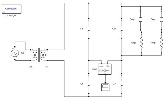 The simulation model of the transformer bridge principle circuit is built by using the MATLAB Simulink program, as shown in Figure 6. Then, the value of the regulating capacitance and the dividing capacitance capacitor is simulated, and finally, the transformer bridge principle circuit is tested. The primary concept behind this simulation is as follows: after the values of the parameters in the circuit have been determined, the output signal from the transformer bridge principle circuit will alter depending on the capacitance value. In accordance with Formulae (29)–(31), the voltage value exclusively linked to capacitance may be derived by sampling and integrating the signal during . To acquire the voltage value corresponding to distinct output signals , first fit the different output signals to obtain the function expression of the output signal , then complete the definite integral solution of the output signal function in the phase interval via the program, and then calculate the capacitance according to Formula (32).