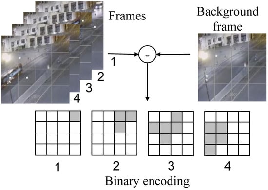 In this way, the four video frames of the example in Figure 1 are encoded into the corresponding four binary arrays. The different binary arrays under this time slice can capture the motion of an object over time, while there is a logical sequence of changes in the binary data of each grid on the time scale. If there is motion behavior, then the motion pattern can be understood by the change process of the video frame through the binary encoding method. The overall pixel profile of a video frame is not always stable. For example, the overall pixel size may change over time due to ambient lighting. If data are sampled and encoded for a short period of time, a fixed selection of background frames can always be maintained, while for complex environmental conditions or long runs, background frames need to be updated at regular intervals or when the background changes to avoid data failure due to large gaps with the current frame image. Binary encoding enables the conversion of high-density image information into low-density binary array parameters that capture the perception of change. The accuracy of the information data is determined by the number of divided grids, and a denser number of divided grids is set if high-accuracy coding is required.