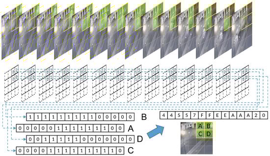 The binary encoding method enables the transformation of the perceived changes in each grid into a simple encoded form of 0 and 1. Each individual grid can be combined on a time scale into a time series of varying lengths that can represent the duration of change. Only because of the binary encoding, each grid exhibits a continuous process of change that can only be represented as a continuous 1. Figure 2 shows a 4 × 4 uniform grid division and a partial video frame of an encoded slice, after binary, encoding of a car driving. The four grids on the upper right of the image are named A, B, C, and D. The encoded data of the different frames of these four grids are collected to form discrete temporal sequences, and four sets of binary discrete sequences with successive changes are obtained. From the time scale, it is easy to see that there is an obvious correlation between the data changes of the four grids, which is closely related to the vehicle movement process, so it will show the sequential changes shown in the figure.