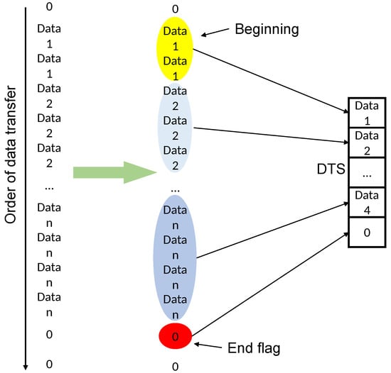 If only binary encoding is used for the combination of the discrete temporal sequence, not only are more agents required, but also the binary encoding can show a very limited variation and can only indicate the presence or absence of object motion. Moreover, if we only look at the data from a single grid, all of the regions where changes exist will only turn out to be no longer stationary when the picture starts to appear at a certain time, and then return to a stationary state again after a period, and the overall object motion process cannot be summarized by a series of individual grid data. Therefore, the exact design of four adjacent grids of data can use hexadecimal data to superimpose a combination of its encoded values for each frame, which not only improves the data richness that is difficult to express in a binary sequence, but also reduces the information density by a factor of four. The information of consecutive frames compressed in a hexadecimal format still retains the regularity of continuous variation. To further improve the information density, the DTS encoding shown in Figure 3 can be applied, which integrates identical data elements and preserves only the changing ones. Moreover, a character “0” is artificially set as an ending symbol to indicate a complete DTS segment. For example, the fourteen frames of the grid in Figure 2 are combined into “44557FFEEAAA20”, which can be reduced to “457FEA20” again if we ignore the repeated encoding segments and keep only the changed parts. This greatly reduces the information density without losing the effective data.