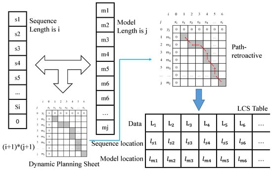 For example, bit a of the input sequence of length i and bit b of the model of length j are compared. If they do not agree, the current (a,b) data take the maximum of (a−1,b) and (a,b−1) values; and when their values are the same, the result of the (a,b) position is the value of its diagonal position (a−1,b−1) + 1. The dynamic planning table of the comparison process is statistically obtained in this way. Subsequently, backtracking from the maximum value is used, i.e., backtracking along the path from decreasing values. If the values of (a−1,b) and (a,b−1) that are adjacent to (a,b) are both smaller than 1, the next path position is (a−1,b−1), but if either (a−1,b) or (a,b−1) has the same value as (a,b), the next path position is the position with the same value. Accordingly, the correspondence table of the LCS in the figure is obtained, where the first row represents the specific characters present in both sequences of the LCS, and the second and third rows correspond to the specific position of each column of the first row, corresponding to its data in the input sequence and in the model. For example, if is 3 and is 4, it means that is the 3rd in the input sequence and the 4th in the model.