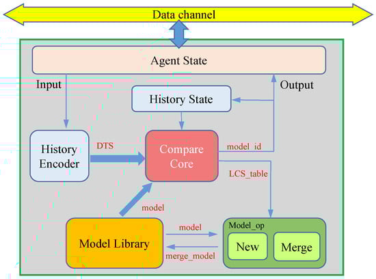 The processing procedure of a single agent, as shown in Figure 5, includes modules such as agent state management, history encoder, compare core, model library, history state, and model_op. The agent state module mainly handles the working status, configuration, data exchange, and other operations of the agent, enabling, for example, the dynamic configuration of the processing area and the adjustment of which specific areas to handle in multi-level structures. The history encoder module receives input encoding information and carries out DTS coding operations, as shown in Figure 3. The compare core module uses the LCS algorithm for similarity comparison, traverses the model library, and finds the best-matching model, where the model ID is outputted and saved in the history state module for prioritized fast comparison of the next frame’s data. The model library saves all of the learned models of the agent, such as using one BRAM as a model library for each agent in Section 4. The model_op module fuses the current complete DTS features with the adapted model based on the LCS matching result, ensuring the model is updated to follow the changing situation.