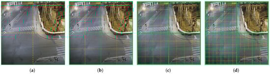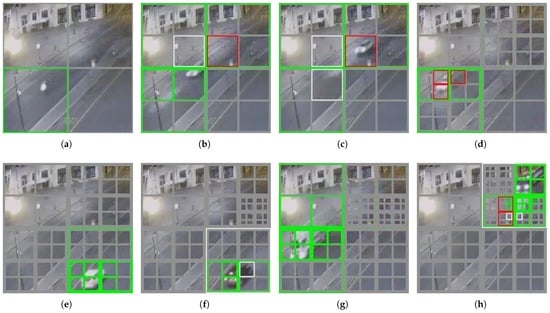 Figure 10 shows the effect of the self-organized dynamic segmentation of part of the upper left corner of the screen in Figure 6. (The area is already an agent monitoring range for the second layer). It can be found that as the number of moving vehicles increases, the system gradually and dynamically performs a more fine-grained regular summary based on the changing clustering categories. The agents used for the computation are configured in regions where more variation exists, such as the upper right part of the region displayed in Figure 10, while its upper left part is largely unsegmented, as the region is mostly static. The gray boxes in Figure 10 represent agents configured to handle corresponding areas. For example, Figure 10a illustrates that an agent on the second level divides the area into four grids, and Figure 10b shows that four third-level agents have been configured to perform finer segmentation, and so on. The green markers indicate the successful matching of behavior models for this region in the current frame, accurately identifying them, while red markers indicate recognition errors.