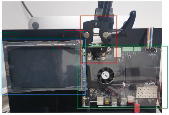 Prototype system. The green box in the picture is the FPGA board, the red box is the MIPI camera, and the blue box is the LCD screen.