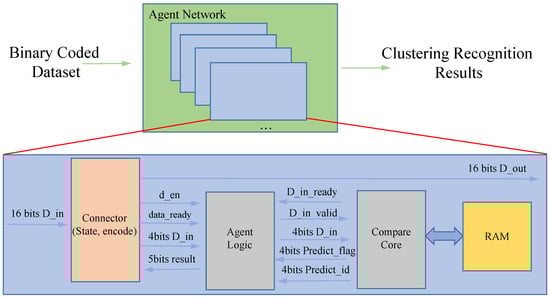 The internal processing logic of each agent in the prototype system is shown in Figure 9. The agent network receives binary encoded data that flow through each agent’s connector module. If an agent is working, information is recorded in the connector module of that agent about the working mode, the area where the data are received, the level they are in, etc. If the binary-encoded data flow through, they are recorded in the connector module of that agent. If the flow through the binary encoded data matches, the data are saved; otherwise, they are passed on with assistance. Of course, when the subdivision has been carried out in the screen monitored by that agent, the transmitted data are saved and passed on at the same time to ensure that higher-level agents can receive the data. In this way, on the one hand, the data flow can save the transmission overhead, on the other hand, it can be effectively managed. Each agent is internally applied with a separately used BRAM to ensure the efficiency of model queries and to avoid I/O problems caused by the frequent use of mass storage.