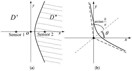 From the fact that the trajectory of a point with a constant distance difference to two points is a hyperbola, we can preliminarily determine that the boundary of the above set may contain several curves. For example, when the system only has two nodes, and , are taken as , , respectively, let the coordinates of node and node in 2D space be , , as shown in Figure 2a. Abbreviating to , the inequality corresponding to the set can be written as