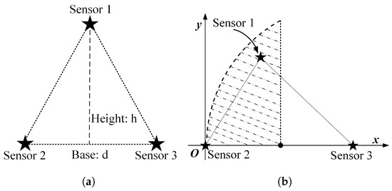 When three nodes present a general triangular layout, at least three variables are required to describe a general triangle. Due to the unintuitiveness of the three-dimensional diagram and the difficulty of theoretical analysis, the specific operation in this subsection is to keep the positions of the two nodes with the largest distance unchanged, traversing the different positions of the other node and analyzing the possible scheduling results. For detail, it is assumed that the distance d between nodes and is the largest, and they are located at and , respectively, in the coordinate system. The traversed area can be reduced by half according to the horizontal symmetry. Then node needs to traverse the area as illustrated in the Figure 3b, where the shaded area is the optional position of node .