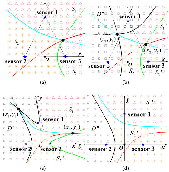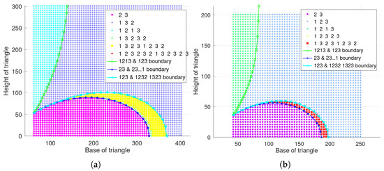 If one of the above conditions is not met, the corresponding boundary curve does not exist. Taking the midpoint of the base of the isosceles triangle as the origin and the base as the x-axis direction to establish a rectangular coordinate system, and setting the base length as d and the height of the triangle as h, the coordinates of the three nodes are , , and , respectively. Then, the information residual distribution map of the system can be drawn according to Equations (22) and (28), as shown in Figure 4a, where the upper triangular, star and circular marker areas represent the sets , , and ; meanwhile, the solid lines are the boundaries of the different set regions. The three boundary curves necessarily intersect at a point, which can be proved by the geometric distance property of the hyperbola. When the rotation angle is 0 and the centre of the curve is at the origin, the general formula of a single curve is