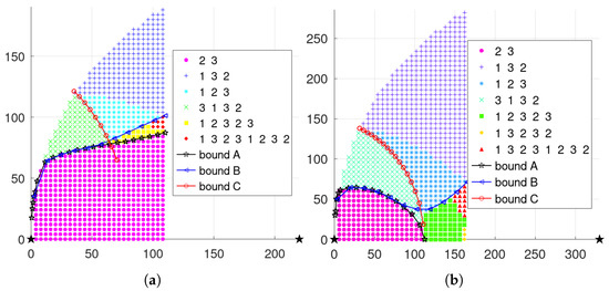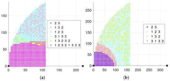 When the traversal step is 5 with parameters and , the main scheduling results are illustrated in Figure 5a, where the horizontal axis represents the values of the base of the isosceles triangle, and the vertical axis represents the height of the isosceles triangle. The scatter points of different shapes in Figure 5a represent a different type of scheduling situation, and their corresponding periodic scheduling sequences are shown in the legend of the figure, respectively. The three curves are the approximate numerical bounds on the critical scheduling case obtained from the previous theoretical analysis and numerical calculation. Specifically, the curve marked by circles represents the boundary node distribution for the cycle scheduling sequence of 1213 and 123. The curve marked by triangles represents the boundary node distribution for the cycle scheduling sequence of 123 and the scheduling result of . In addition, the curve marked with pentagrams represents the critical distribution of the scheduling sequence 23 and , and the interval between two node activations is not greater than , where and correspond to the values taken on the boundary curve. In addition, when the traversal step is 4 with and , the result is shown in the Figure 5b.