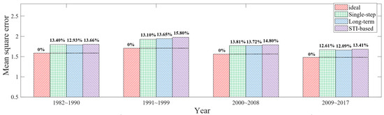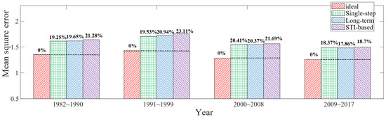 The time span of each evaluation is nine years, which are 1982–1990, 1991–1999, 2000–2008, 2009–2017, respectively. Moreover, the model parameters were extracted mainly using the data from the first three years used in each experiment. The experimental results are shown in Figure 9. The ideal scheduling method has the best performance with the minimum scope mean square error.