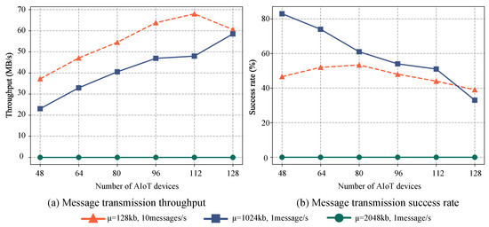 The performance of message transmission with different quantities and characteristics varies as the number of AIoT edge devices increases. (a) The throughput variation and (b) the success rate variation.