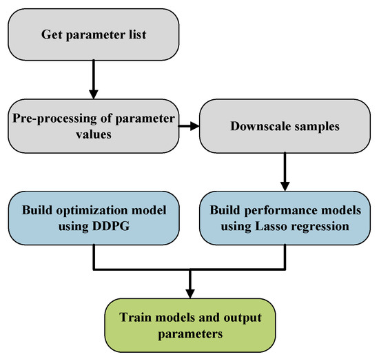 The DMSCO algorithm is a four-phase process that optimizes our AIoT distributed message system. The first phase involves obtaining a parameter list that includes all adjustable variables. In the second phase, principal component analysis (PCA) [16] is utilized to reduce the dimensionality of the parameter list. The third phase involves filtering the preprocessed parameter list using Lasso regression [17] to identify significant variables and build a performance model mapping input configurations to performance metrics. In the fourth phase, the optimization process is initiated by passing the runtime metrics dataset to the reinforcement learning model and dynamically optimizing using the deep deterministic policy gradient (DDPG) algorithm. In summary, our contributions are as follows