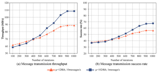 As depicted in Figure 5, the optimized distributed message system demonstrates consistent improvement in the message transmission success rate across various high-concurrency scenarios. In the initial configuration, the IoT terminals transmit 10 messages per second, where the size of each message follows a normal distribution with a mean () of 128 KB in the high-frequency small-message scenario. Comparatively, in the low-frequency large-message scenario, each terminal sends one message per second, and the size of each message adheres to a normal distribution with a mean () of 1280 KB. The message transmission success rate is slightly higher in the low-frequency large-message scenario than in the high-frequency small-message scenario initially. However, as the iteration count approaches approximately 400, the success rates intersect, indicating their near equivalence. Beyond 400 iterations, a significant enhancement in the message transmission success rate is observed for the low-frequency large-message scenario, surpassing the performance of the high-frequency small-message scenario.