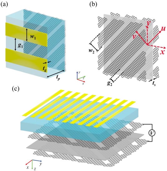 The thickness of the dielectric substrate layer was tp = 40 μm, and the material was TOPAS polymer with a relative dielectric constant of 2.35, which is an ideal terahertz dielectric substrate material due to its extremely low loss and low birefringence in the terahertz band [27]. As shown in Figure 2b, the first graphene grating layer and the second graphene grating layer were composed of two identical graphene gratings, with included angles of 45° relative to the x-axis. The graphene width w2 = 1.8 μm, and the mutual interval g2 = 3.8 μm. Between the two layers of graphene gratings was a silicon dioxide insulating isolation layer with height ts = 0.1 μm. Figure 2c shows the sandwich structure composed of graphene–silicon dioxide–graphene. The graphene grating layers served as the gate electrode, with one layer of graphene connected to the positive electrode and the other to the negative electrode [28].