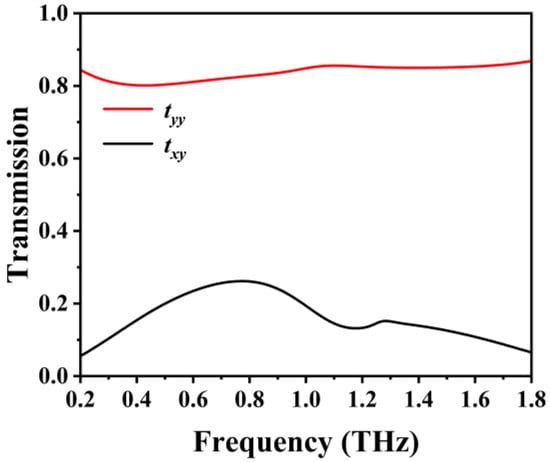 Figure 4 depicts the HFSS-simulated transmission characteristic of the proposed structure in the off-state [37]. A planar periodic structure comprises identical unit cells; therefore, it is evaluated using Floquet ports and master–slave boundary conditions. The master–slave boundary conditions, also recognized as linked boundary conditions, were employed to simulate planar periodic structural surfaces. The proposed structure works in the off-state with the graphene Fermi energy level EF = 0. When y-polarized linearly polarized waves are incident, the co-polarized waves transmit with high efficiency in the operating frequency band of 0.35–1.75 THz, with a transmission greater than 0.80, whereas the cross-polarized waves transmit with essentially little efficiency and a transmission smaller than 0.30. Thus, most transmitted waves are co-polarized; there is little change in the polarization state of the transmitted waves relative to the incident waves, and the polarization rotator will not work in the off-state of the graphene grating.