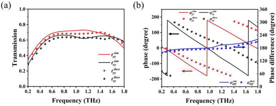 Figure 5a illustrates the simulated and theoretically calculated transmittance in the on-state for the graphene Fermi energy level of 1 eV, which are in reasonable agreement with each other. In the working frequency band, the transmission amplitudes of co-polarized and cross-polarized waves are nearly equal, and both are kept above 0.6. Figure 5b shows the phase φyy of the transmitted co-polarized waves and the phase φxy of the transmitted cross-polarized waves, as well as the phase difference between them. Both the simulated and theoretically calculated results show that the phase difference maintains nearly 180° in the whole working band, indicating that the generated transmitted waves are linearly polarized waves. There may be some inconsistencies due to errors in the MIT. Nevertheless, we believe that the differences observed fall within an acceptable range and can still be used to effectively verify the characteristics of the polarization converter.