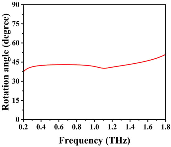The simulated results meet the requirements of the desired Stokes parameters. The polarization rotation angle, which is calculated using Equation (10), is described as the angle by which the polarization direction rotates relative to the polarization direction of the incident waves. When the polarization rotator is in the on-state, the polarization rotation angle of transmitted waves with incident y-polarized waves of 0° is turned to nearly 45°. Within a frequency range of 0.35–1.75 THz, the polarization rotation angle of transmitted waves, as shown in Figure 6, was kept at around 45°. Hence, the proposed polarization rotator demonstrated the desired level of functionality.